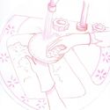 petits fours, cerises confites...; linogravure et cire à épiler moulée